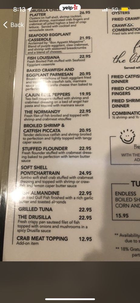 Located in Baton Rouge, Drusilla Seafood Restaurant offers an inviting blend of classy and casual dining. Known for its diverse menu, it serves a range of dishes from fried catfish to stuffed jumbo shrimp, ensuring fresh seafood options for all tastes.