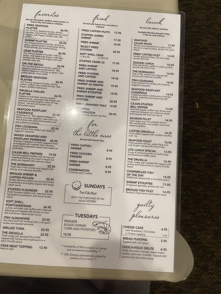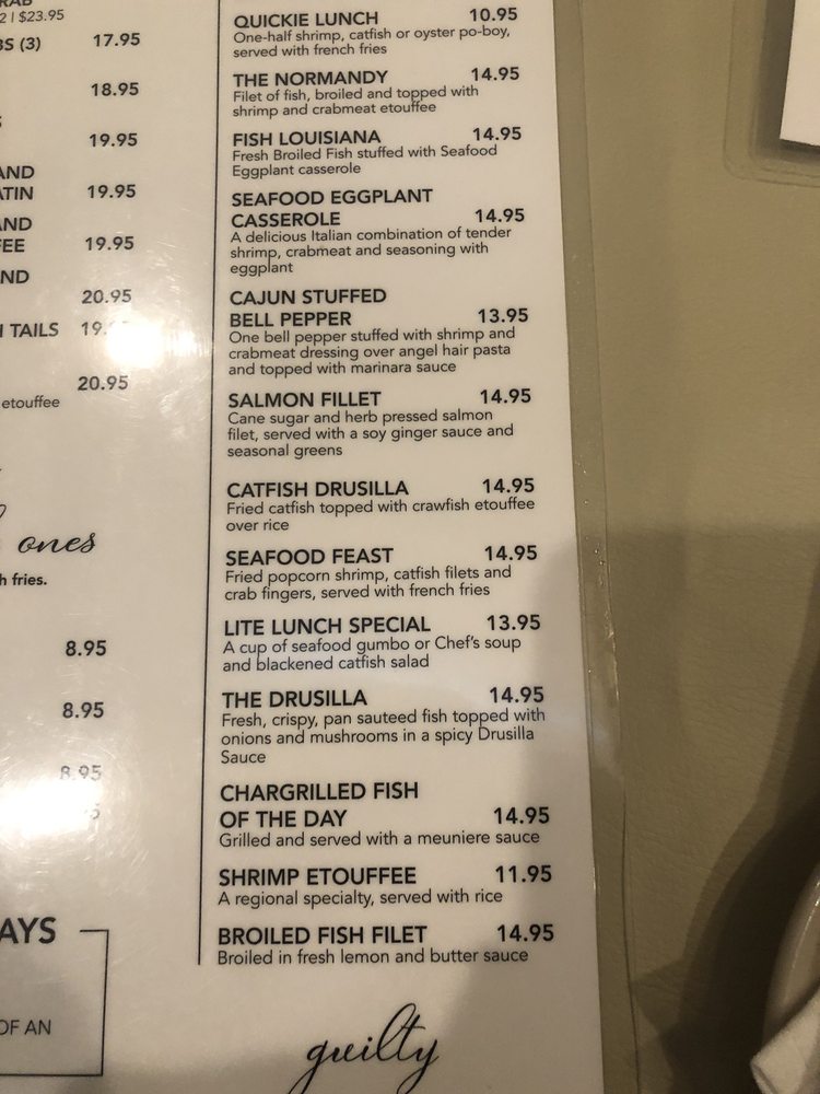 - Entrée Highlights: The Steak Drusilla, topped with a savory shrimp sauce, stands out for its exquisite flavor, while the Fish Louisiana enchants with its baked, eggplant-stuffed filet.