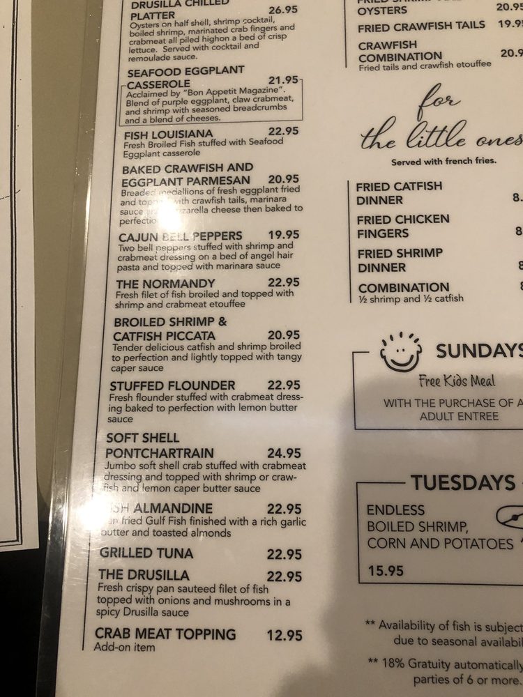 Seafood gumbo, seafood eggplant casserole, shrimp au gratin, fried jumbo shrimp, fried catfish and green salad.